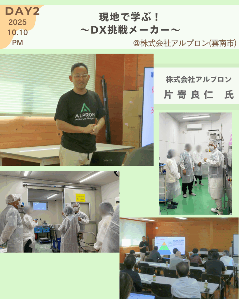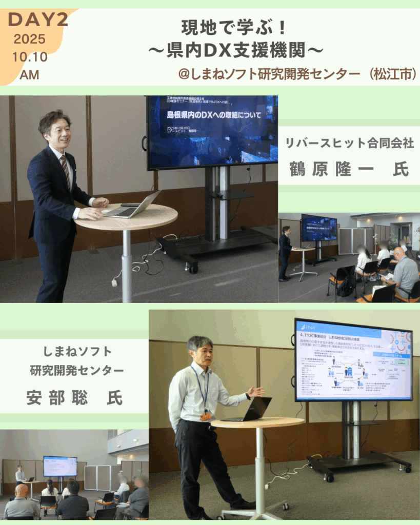 2日目は、テクノアークしまね(松江市)にて、リバースヒット合同会社の鶴原氏、しまねソフト研究開発センターの阿部氏に島根県内のDXへの取り組みについてご講演いただき、午後からは、DXへ取り組む企業・株式会社アルプロン(雲南市)へ訪問し、片寄氏にご説明いただきました🙂↕️