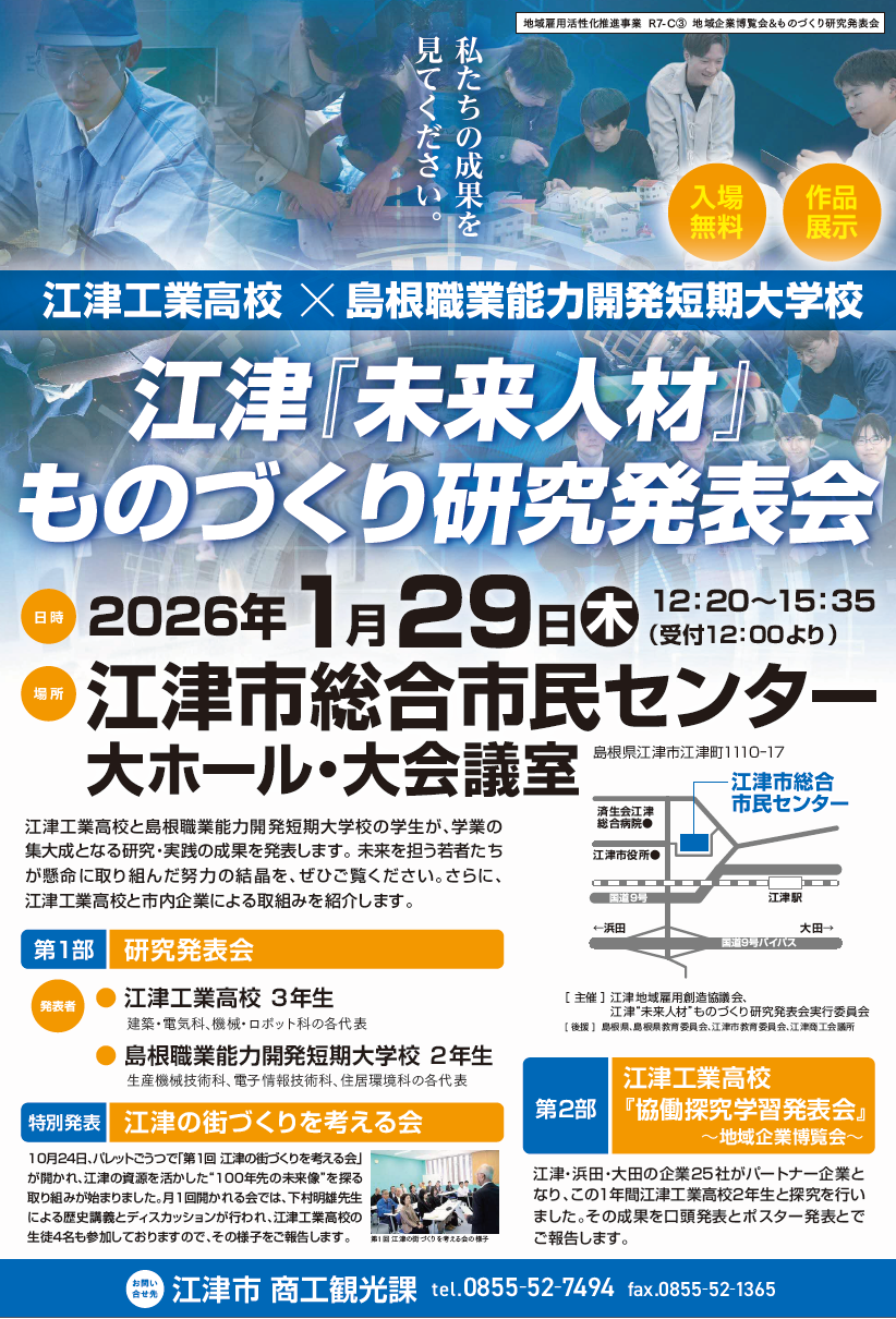 江津工業高校と島根職業能力開発短期大学校の学生が、学業の集大成となる研究・実践の成果を発表します😀