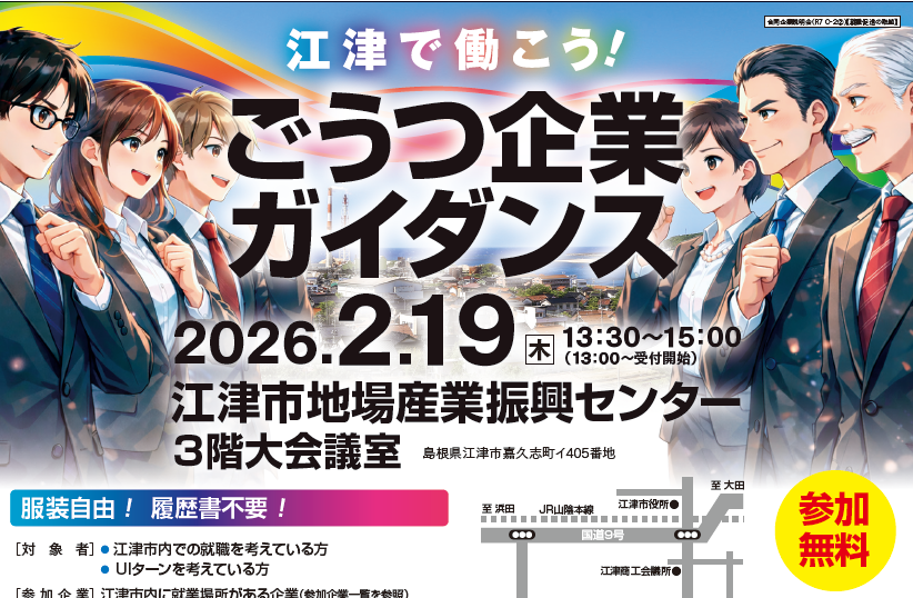 江津で働こう!ごうつ企業ガイダンス 「江津にはどんな企業があるの🤔?」「求人票やネットの情報だけでは分からないことを直接聞いてみたい🧐!」これらのお悩みを解決できるかも⁉企業と繋がるキッカケとなるイベントです🙌...