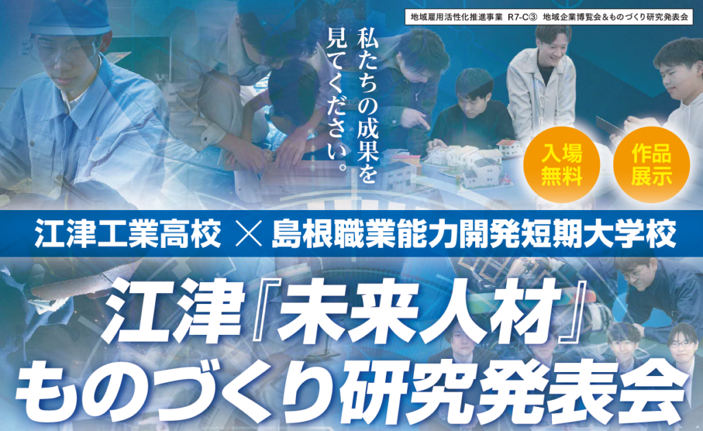 江津『未来人材』ものづくり研究発表会&江津の街づくりを考える会&協働探究学習発表会 江津工業高校と島根職業能力開発短期大学校の学生が、学業の集大成となる研究・実践の成果を発表します😀未来を担う若者たちが懸命に取り組んだ努力の結晶を...